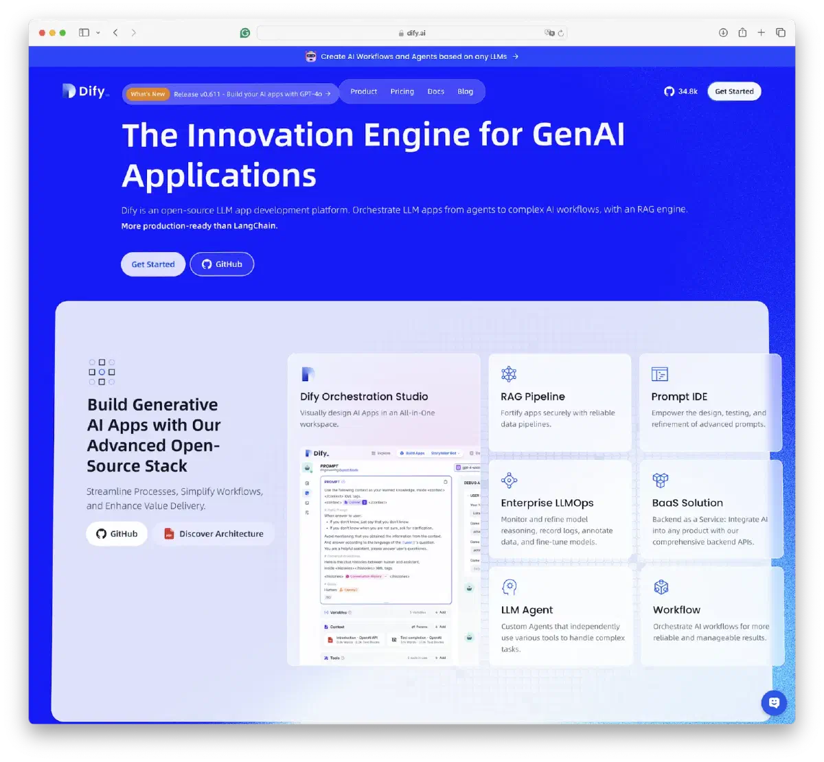 Dify 是一个生成式 AI 应用创新引擎,开源的 LLM 应用开发平台。提供从 Agent 构建到 AI workflow 编排、RAG 检索、模型管理等能力,帮助用户轻松构建和运营生成式 AI 原生应用。