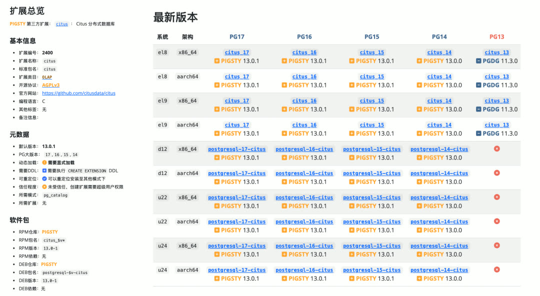 PG 扩展目录已整合到文档站 pigsty.cc/ext 中,并提供中文版本。小工具可自动扫描 Pigsty 与 PGDG 仓库扩展包版本并生成数据库记录、信息页,用户可直接从网页浏览并下载扩展 RPM/DEB 包。